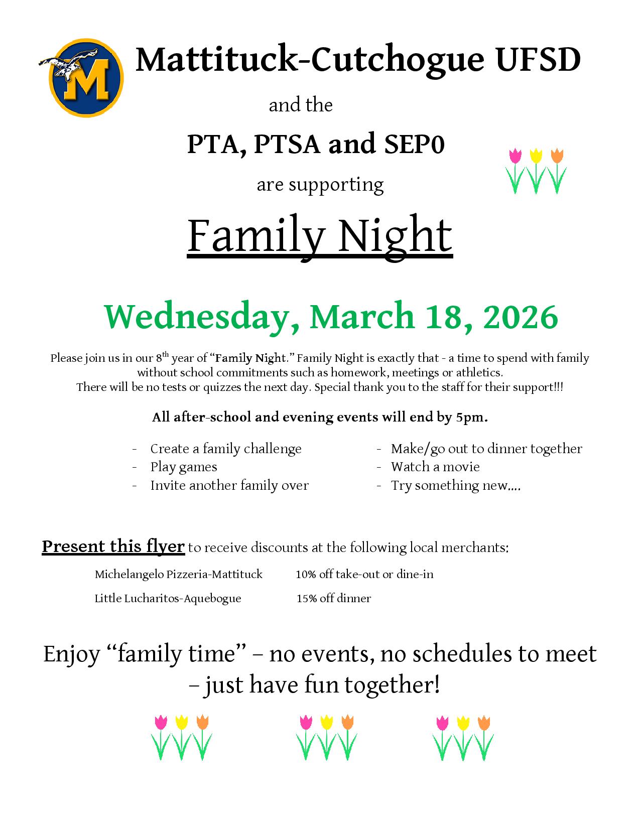 Please join us in our 8th year of "Family Night" on Wednesday, March 18, 2026. Family Night is exactly that - a time to spend with family without school commitments such as homework, meetings or at...
