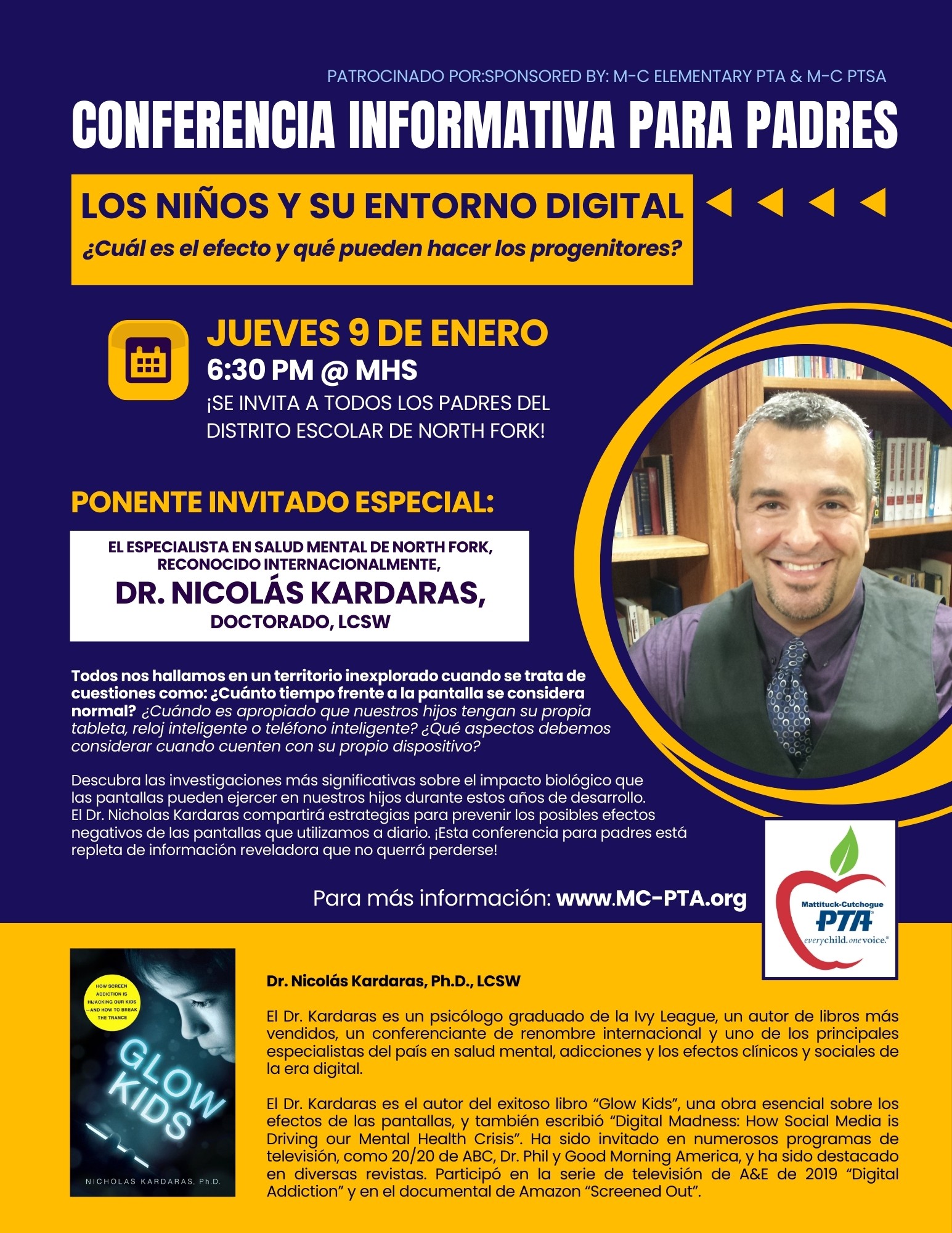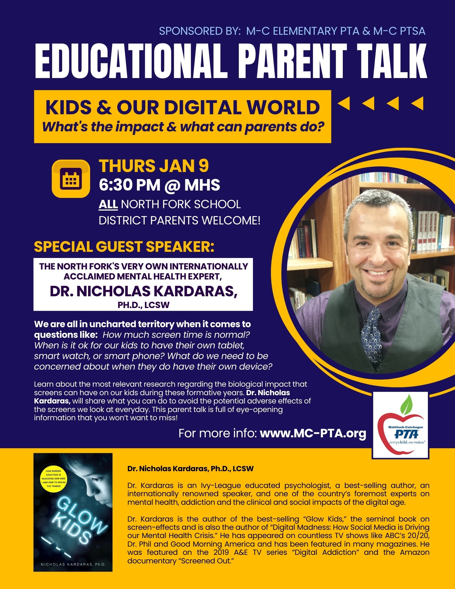 All are welcome to attend an educational parent talk sponsored by the M-C Elementary PTA and the MCPTSA on Thursday, January 9, 2025 at 6:30 PM in the Mattituck High School Auditorium. Dr. Nicholas Kardaras, PH.D., LCSW will be the guest speaker who presented this information on "Kids and Our Digital World" to all faculty and staff on Superintendent's Conference Day held last month. We hope you are able to attend this very informative program. See the flyer for more details.